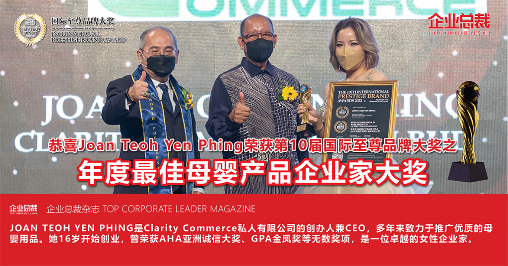 JOAN TEOH(张艳萍)是 Clarity Commerce 私人有限公司的创办人兼 CEO,多年来致力于推广优质的母婴用品,公司旗下拥有多个著名品牌,包括韩国知名母婴用品品牌 Mother-K 和其子品牌 K-Mom,荣获德国红点大奖的韩国人气消毒箱品牌 JJOBI 等等,其中 Mother-K 更成为全马唯一一家获得政府医院认可及使用的母婴品牌,也深受许多父母包括知名艺人的喜爱。
