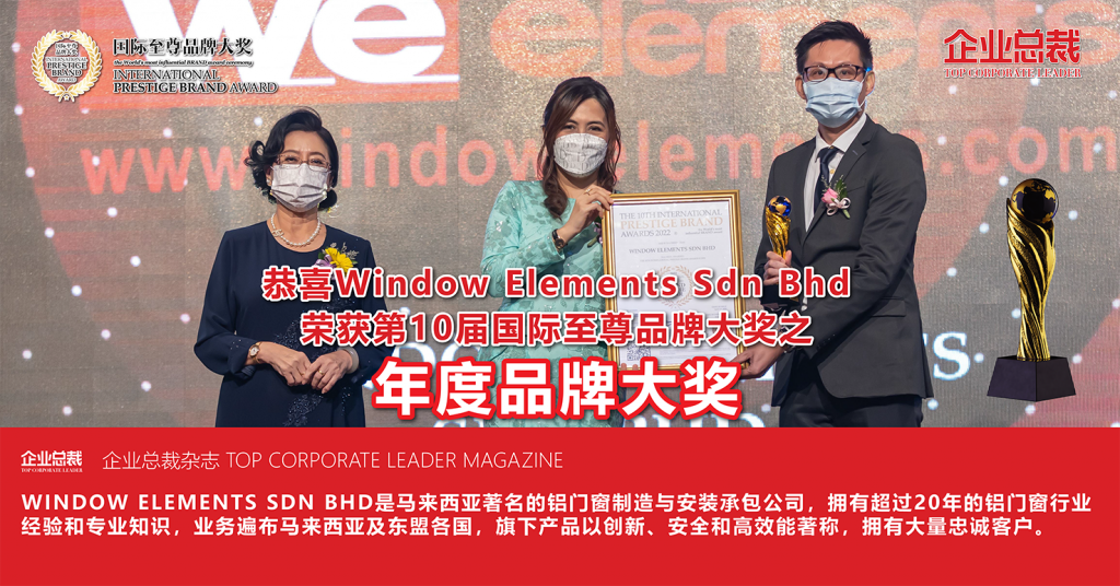 WINDOW ELEMENTS 是马来西亚著名铝门窗制造与安装承包公司,拥有庞大的客户群,公司业务遍布马来西亚及东盟各国,疫情期间公司在大力改革之下,业绩持续增长,因而继 2021 年获得 AHA亚洲诚信大奖之后,公司再次于 2022 年荣获 IPBA国际至尊品牌大奖的肯定。