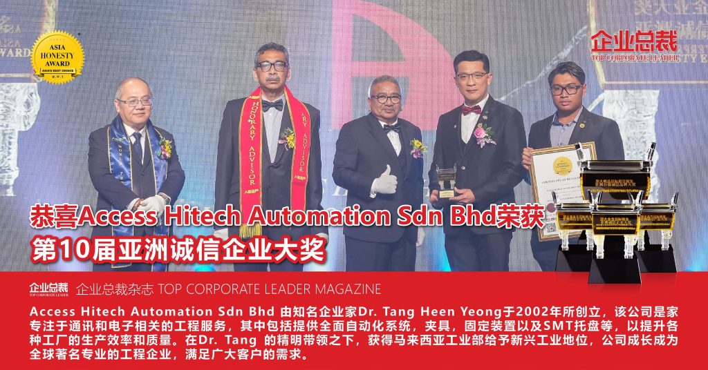 Access Hitech Automation Sdn Bhd 由知名企业家Dr. Tang Heen Yeong于2002年所创立,该公司是家专注于通讯和电子相关的工程服务,其中包括提供全面自动化系统,夹具,固定装置以及SMT托盘等,以提升各种工厂的生产效率和质量。在Dr. Tang 的精明带领之下,获得马来西亚工业部给予新兴工业地位,公司成长成为全球著名专业的工程企业,满足广大客户的需求。