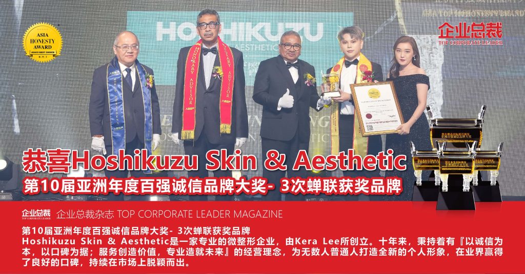 Hoshikuzu Skin & Aesthetic是一家专业的微整形企业,由Kera Lee所创立,主要提供服务包括:个人形象咨询、皮肤治疗、皮肤保养、微整形等,并由Hoshikuzu经验丰富、责任感十足、专业态度的团队医师操作,高效解决客户一切问题。目前,公司更积极扩展业务,除了一系列医美服务外,还添加了专业美甲服务,备受顾客青睐。十年来,公司秉持着有『以诚信为本,以口碑为据;服务创造价值,专业造就未来』的经营理念,为无数人普通人打造全新的个人形象,找回自信,提升自身魅力,从一个平凡无奇的人,因微整形而改变人生。公司卓越的技术和多样化服务,在业界赢得了良好的口碑,持续在市场上脱颖而出,2022年再度荣获亚洲年度蝉联百强诚信品牌大奖,可说是实至名归。