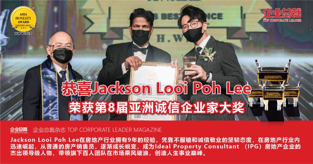 诚信是企业家的立业之本,决心是事业成功的驱动力,Jackson Looi Poh Lee在房地产行业拥有9年的经验,凭靠不服输和诚信敬业的坚韧态度,在房地产行业内迅速崛起,从普通的房产销售员,逐渐成长蜕变,成为Ideal Property Consultant (IPG)房地产企业的杰出领导级人物,带领旗下百人团队在市场乘风破浪,创造人生事业巅峰。