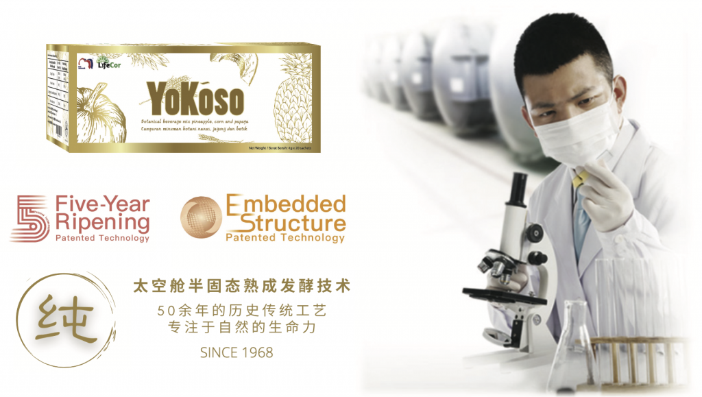 YoKōso 是采用经过 50 多年研发的国际专利半固态发酵技术,独创「太空舱」休眠设备,让微生物与植物萃取精华在特殊条件下产生化学变化,历经培养起、成长期、精进期与后发酵期 4 大阶段,并坚持 5年以上的高熟成期,打造高活性、纯度、稳定性,质精量多的酵素产品。