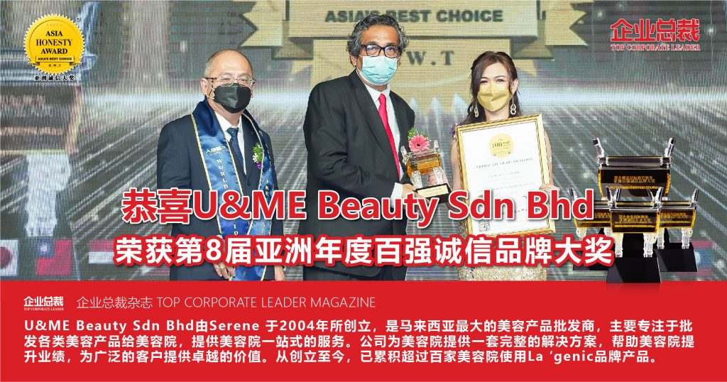 U&ME Beauty Sdn Bhd由Serene 于2004年所创立,是马来西亚最大的美容产品批发商,主要专注于批发各类美容产品给美容院,提供美容院一站式的服务。公司成立多年,拥有丰富的经验,能够为美容院提供一套完整的解决方案,帮助美容院提升业绩,为广泛的客户提供卓越的价值。从创立至今,已累积超过百家美容院使用La ‘genic品牌产品。