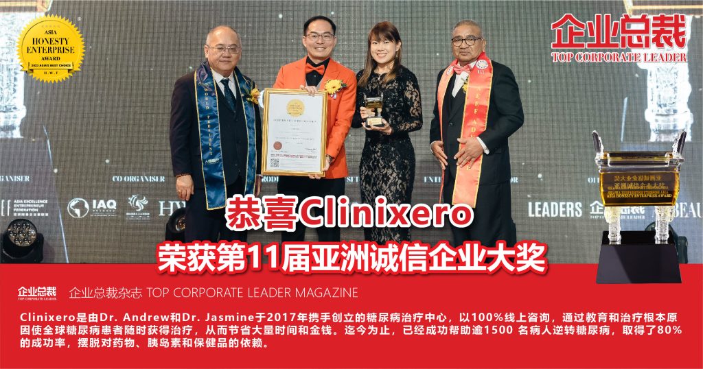 Clinixero是由Dr. Andrew和Dr. Jasmine于2017年携手创立的糖尿病治 疗中心,以100%线上咨询,通过教育和治疗根本原因使全球糖尿病患者随时获得治疗,从而节省大量时间和金钱。迄今为止,已经成功帮助逾1500 名病人逆转糖尿病,取得了80%的成功率,摆脱对药物、胰岛素和保健品的依 赖。2022年,Clinixero荣获马来西亚纪录大全颁发的“Most Patients in a Virtual Diabetic Programme”奖项。2022年Dr. Andrew入围马来西亚国际青 年企业家创意奖(CYEA)30强,及被Britishpedia评选为马来西亚成功人士。