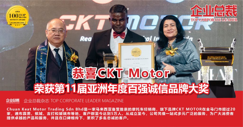 Chuan Keat Motor Trading Sdn Bhd是一家马来西亚备受推崇的摩托车经销商,旗下品牌CKT MOTOR在全马门市超过20家,遍布霹雳、槟城、吉打和玻璃市等地,客户群至今达到5万人。从成立至今,公司凭借一站式多元广泛的服务,为广大消费者提供卓越的产品和服务,并且在口碑相传下,累积了多名忠诚的客户。