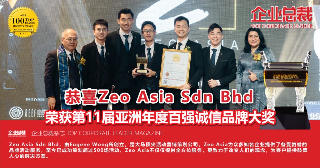 Zeo Asia 凭借在行业内的杰出贡献,屡次荣获各大奖项的肯定,其中包括AHA 亚洲百强诚信品牌大奖、Platinum Business Award、SME 100 Award、The Marketing Events Award等等。