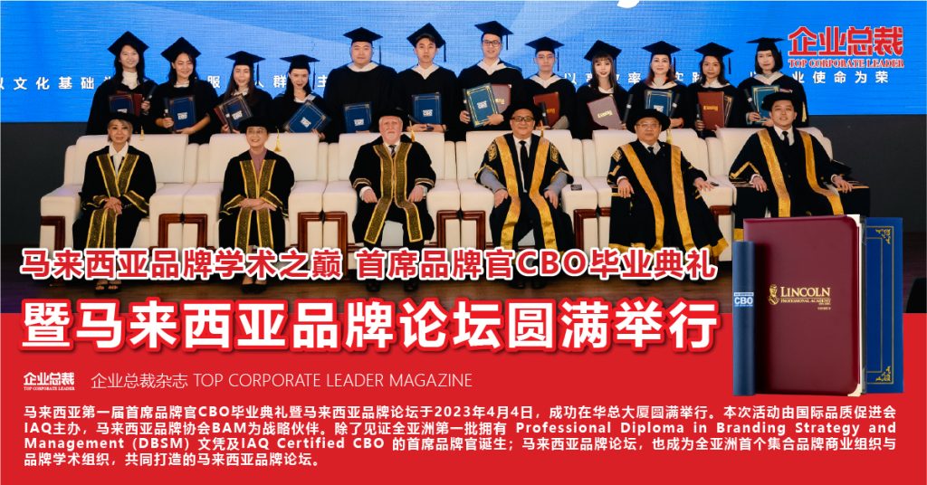 马来西亚第一届首席品牌官CBO毕业典礼暨马来西亚品牌论坛于2023年4月4日,成功在华总大厦圆满举行。本次活动由国际品质促进会IAQ主办,马来西亚品牌协会BAM为战略伙伴。除了见证全亚洲第一批拥有 Professional Diploma in Branding Strategy and Management (DBSM) 文凭及IAQ Certified CBO 的首席品牌官诞生;马来西亚品牌论坛,也成为全亚洲首个集合品牌商业组织与品牌学术组织,共同打造的马来西亚品牌论坛。