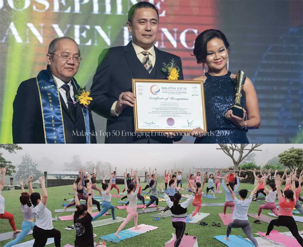 Josephine Chan Yen Peng 是 Surya Yoga Sdn Bhd 的创办人,马来西亚50大新锐企业奖。自19岁起便开始接触瑜伽,并在2002年创立了自己的第一家瑜伽馆,她热衷于将这份健康与心灵平衡的体验传递给更多人。她也是马来西亚首开先河推出“孕妇瑜伽”,以创新的方式在市场中开辟了新天地。经过最初十年的积累,Josephine 在此后逐年扩展业务,如今已拥有22间分馆,带动了全马瑜伽行业的蓬勃发展。
